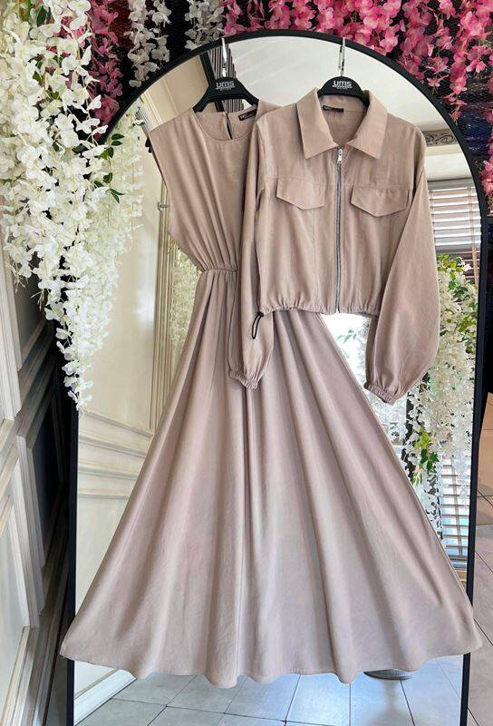 ZUGGE CEP KAPAKLI CUPRA CEKET VE ELBİSE İKİLİ TAKIM B11-3-1609-48-BİSKÜVİ